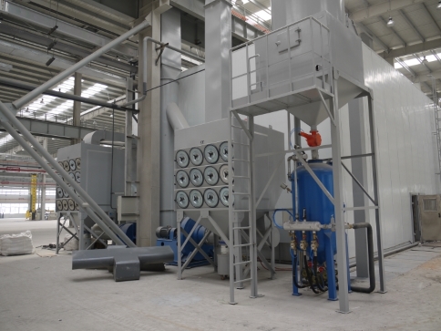 噴砂房除塵系統包括吸、排塵管道、底部和側部吸塵口、模塊化濾筒除塵器、排塵風機、排塵煙囪等部分組成。在噴砂房內本除塵系統采用上進風,下及側排風的循環吸塵處理方式(見房體工作原理圖)。潔凈空氣由房體的頂部進入噴砂房內,除塵風機將房內污染濁的氣體通過各個吸塵口吸入除塵器內進行收集處理。