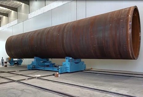 設備輸送臺車及工件自動轉動系統 風電塔筒輸送平車 1、風電塔筒輸送臺車采用電動鉚鏈牽引自動行走形式。變頻電機及滑動輪都設置噴丸室外面的兩端,電機向前轉動時,臺車進入噴丸房,后退時,臺車駛出噴丸房。臺車分為兩節,中間以一個電動調節轉動輪加以連接,通過轉動輪的轉動