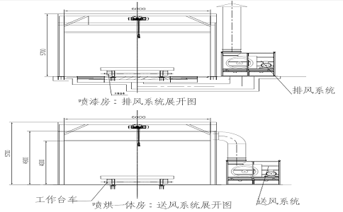 本機車噴烘一體房用于工件噴漆時捕捉漆霧、處理漆霧,以及油漆烘干、廢氣治理功能,且嚴格按照國家有關勞動安全、衛(wèi)生、消防及環(huán)保等方面的標準進行設計,通、排風根據(jù)噴漆的工藝要求實施。