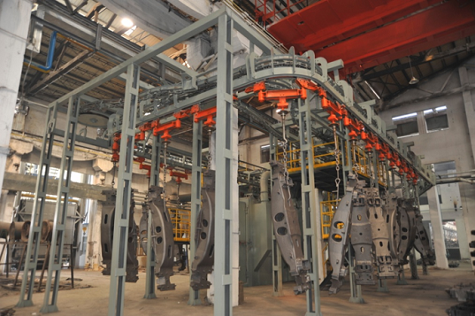 懸鏈通過式拋丸機應用于汽車、客車、專用車、拖拉機、柴油機、摩托車、專用車、航空航天、軌道交通等行業中科懸掛零件、鑄造件、結構件、鍛造件的拋丸清理強化作業