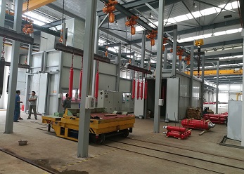 此噴涂線中工件輸送一般采用電動(dòng)軌道車或天車為輸送方式。該噴涂線主要用于金屬工件、并且材質(zhì)較厚、工件較大的設(shè)備、鋼板,如鑄鍛件、鋼結(jié)構(gòu)件等。1噴1烘一般適合表面要求較低的設(shè)備(一般不建議采用),一般情況下,由于工件較大、重,生產(chǎn)量不高的情況下,噴砂(丸)、除塵都在噴砂房內(nèi)處理。噴底漆、面漆、烘干都在噴烘一體房內(nèi)進(jìn)行。